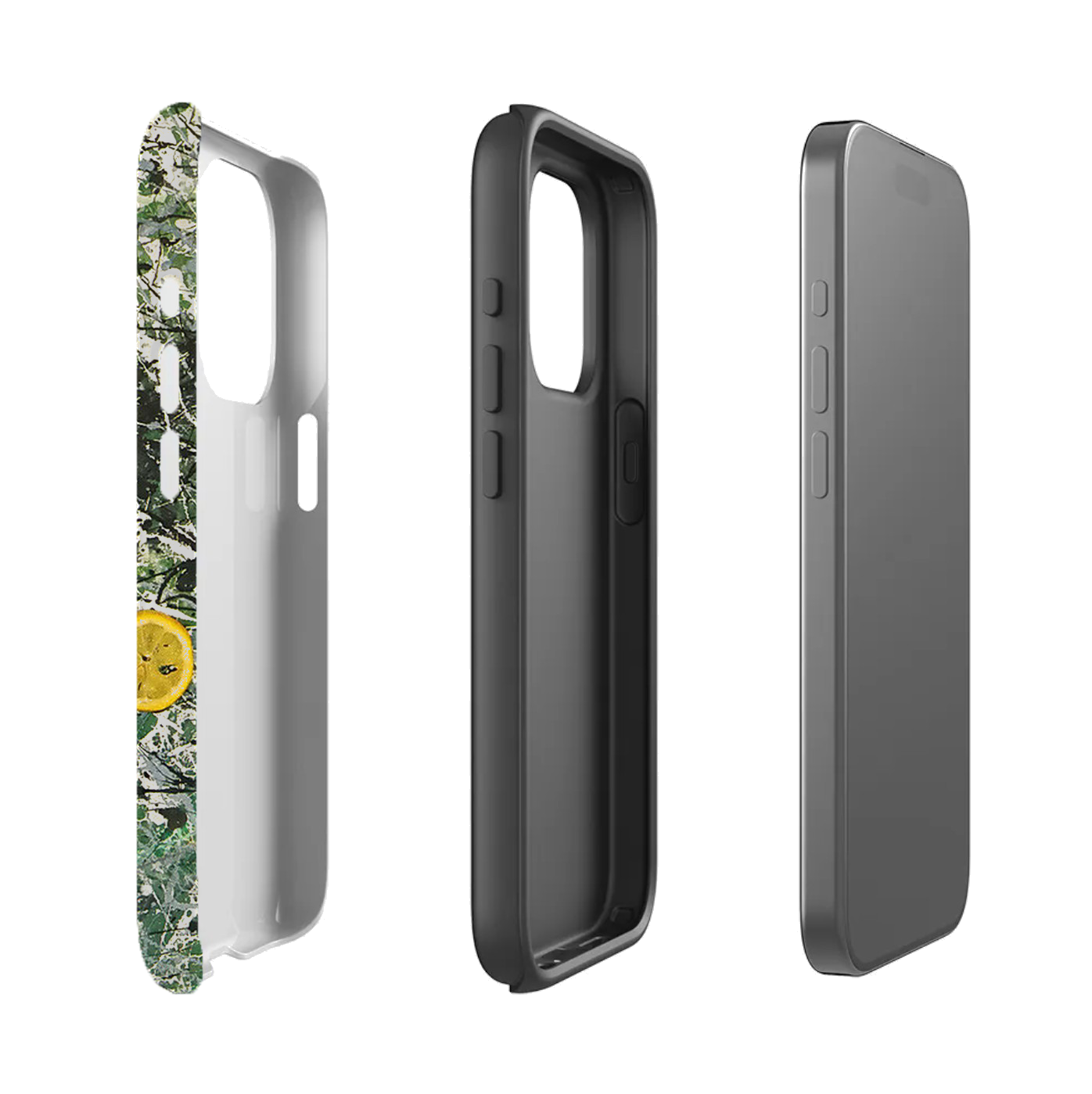 Protect your phone in style. Our tough cases combine a shatterproof outer with a soft silicone lining for maximum protection. Featuring a premium wraparound print with a matte finish. They’re durable, lightweight, and wireless charging-ready. This design features a green Jackson pollock outer shell wrap around and a black inner silicone lining.