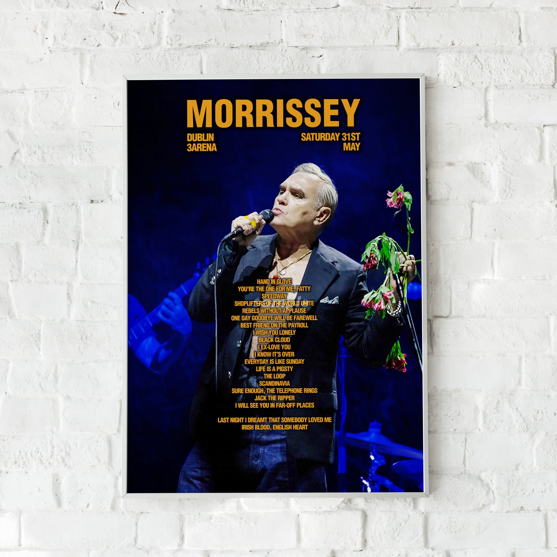 Celebrate an unforgettable night of music with this stunning Morrissey Dublin 3Arena Setlist Print, commemorating the iconic performance on Saturday 31st May. Printed on high-quality 180gsm matte paper, this poster captures the raw emotion and stage presence of Morrissey as he delivered a powerful set at Dublin's 3Arena.