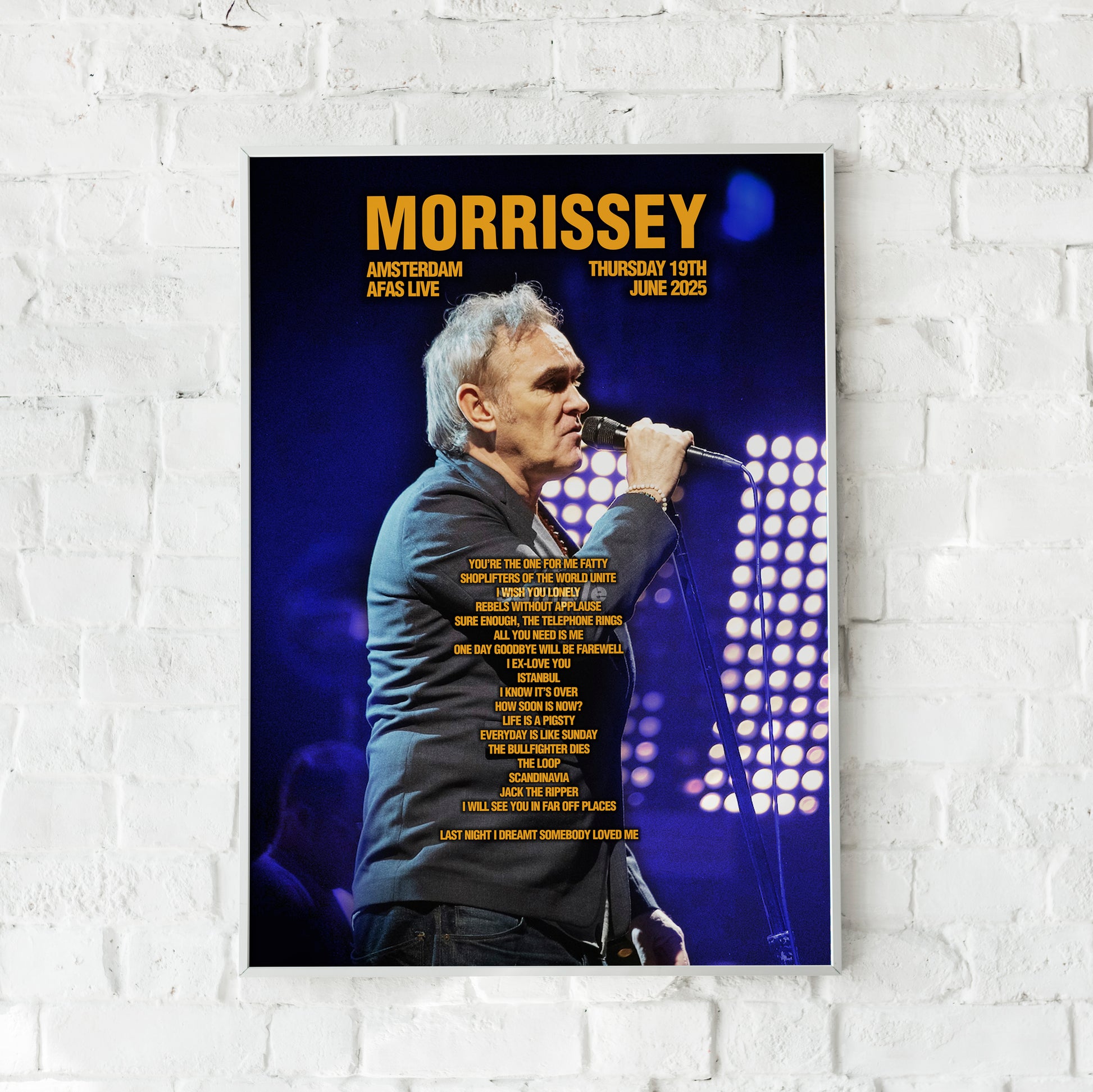 Celebrate an unforgettable night of music with this stunning Morrissey Amsterdam AFAS Live Setlist Print, commemorating the iconic performance on Thursday 19th June. Printed on high-quality 180gsm matte paper, this poster captures the raw emotion and stage presence of Morrissey as he delivered a powerful set at Amsterdam AFAS Live.