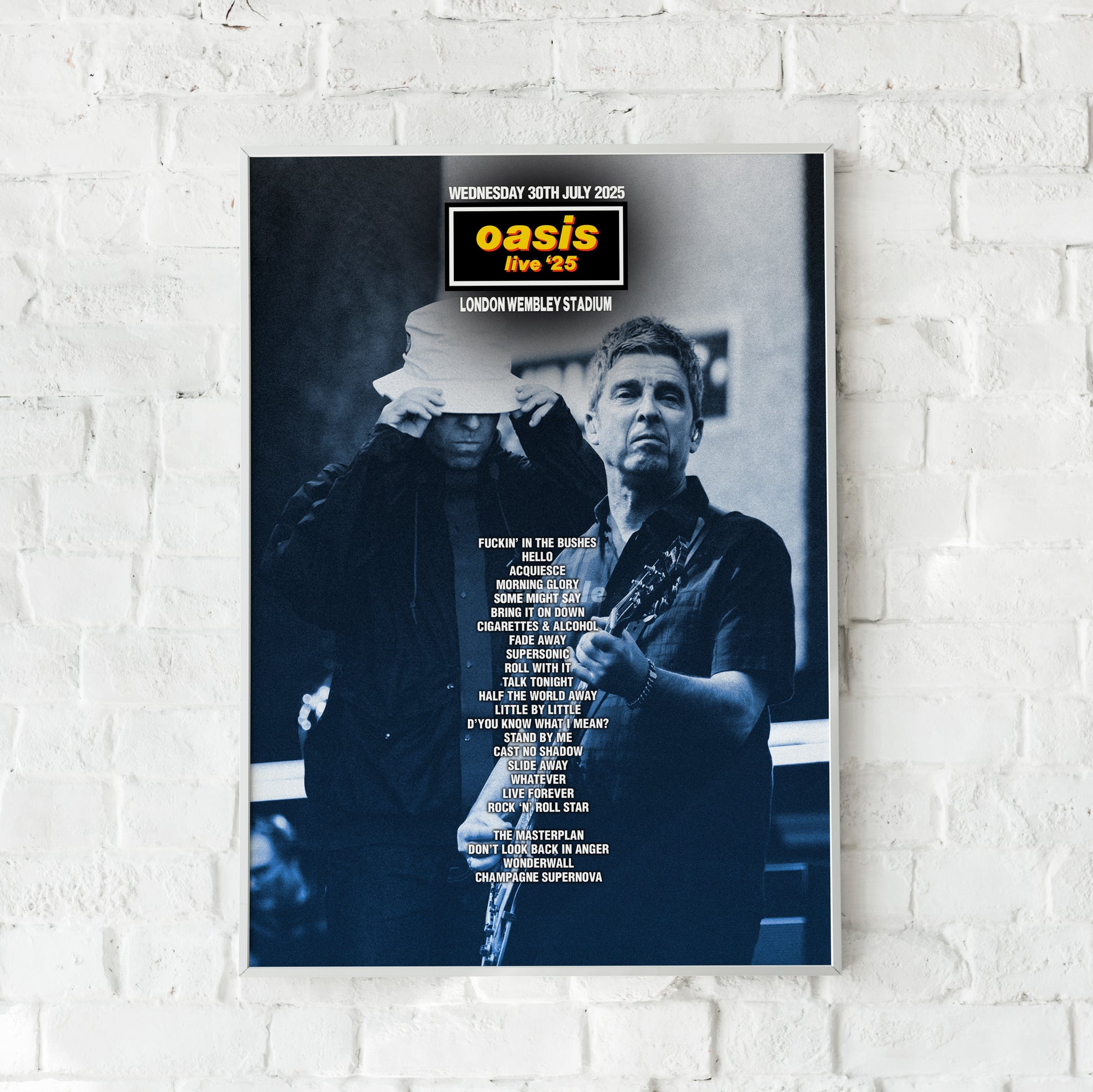 Celebrate an unforgettable night of music with this stunning Oasis Live '25 London Wembley Stadium Setlist Print, commemorating the iconic return performance on Wednesday 30th July 2025. Printed on high-quality 180gsm matte paper, this poster captures the raw emotion and stage presence of Oasis as they delivered a powerful set at Wembley Stadium.