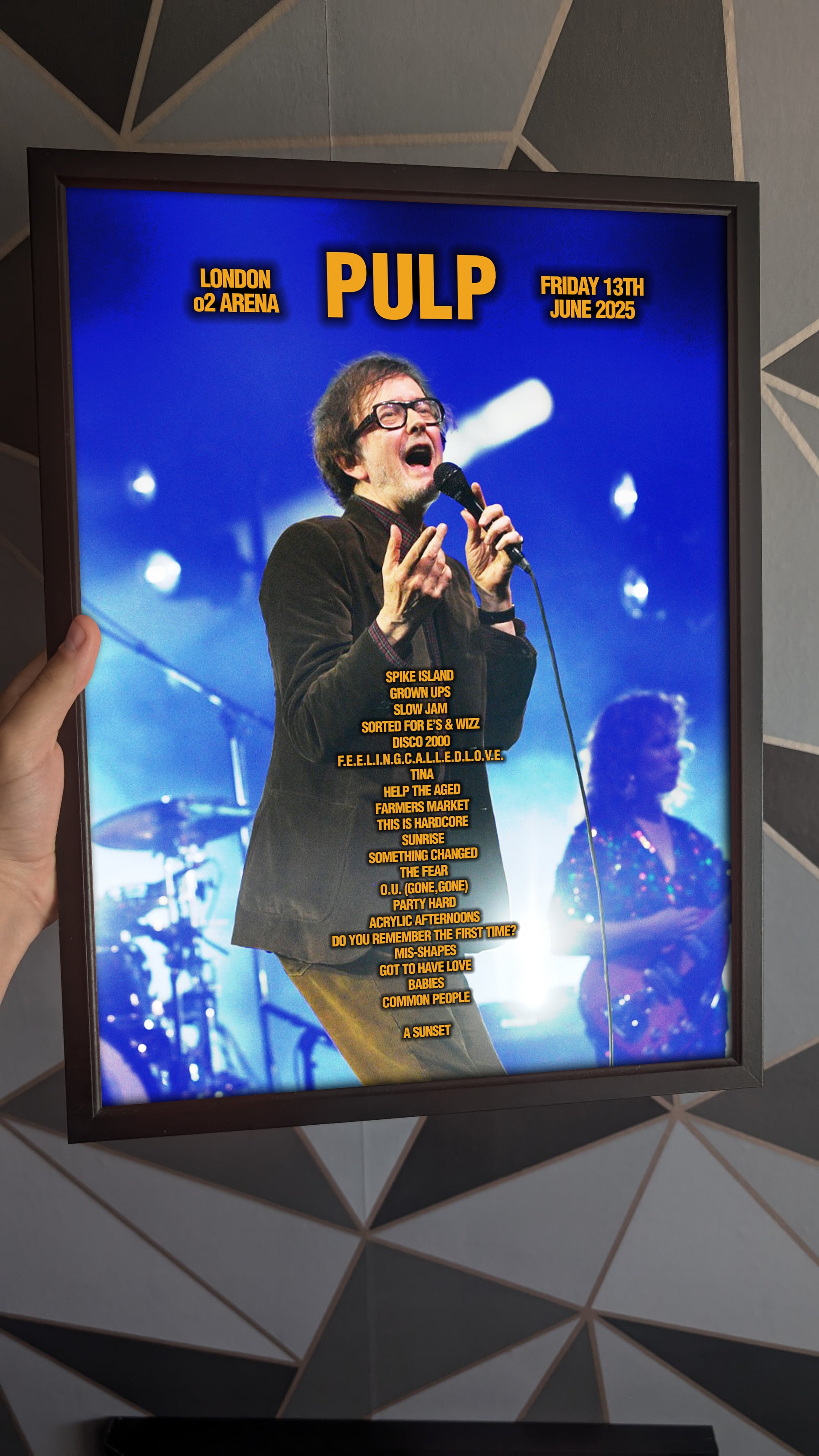 Celebrate an unforgettable night of music with this stunning Pulp London o2 Arena Setlist Print, commemorating the iconic performance on the 13th and 14th June 2025. Printed on high-quality 180gsm matte paper, this poster captures the raw emotion and stage presence of Jarvis Cocker as he delivered a powerful set at London's o2 Arena.