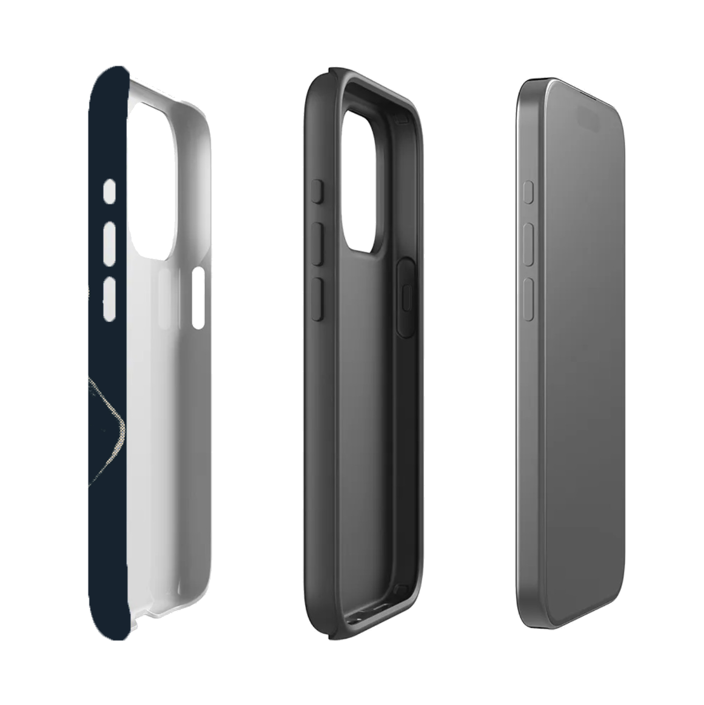 Protect your phone in style. Our tough cases combine a shatterproof outer with a soft silicone lining for maximum protection. Featuring a premium wraparound print with a matte finish. They’re durable, lightweight, and wireless charging-ready. This design features a dark blue outer shell wrap around and a black inner silicone lining.